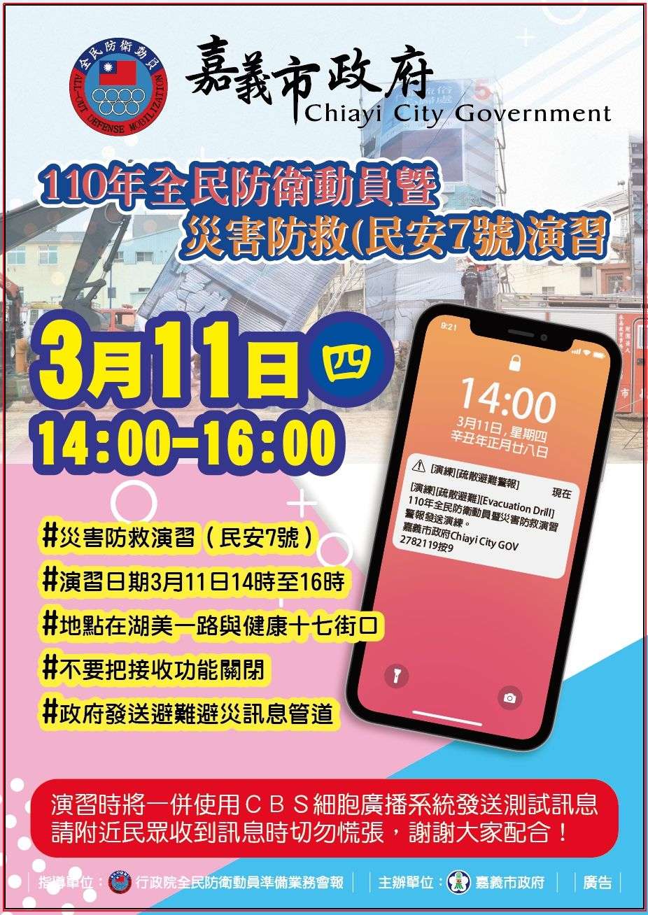 本次演習時間訂於109 年3 月11 日14 時至16 時止,於湖美一路與健康十七街口實施本市110 年全民防衛動