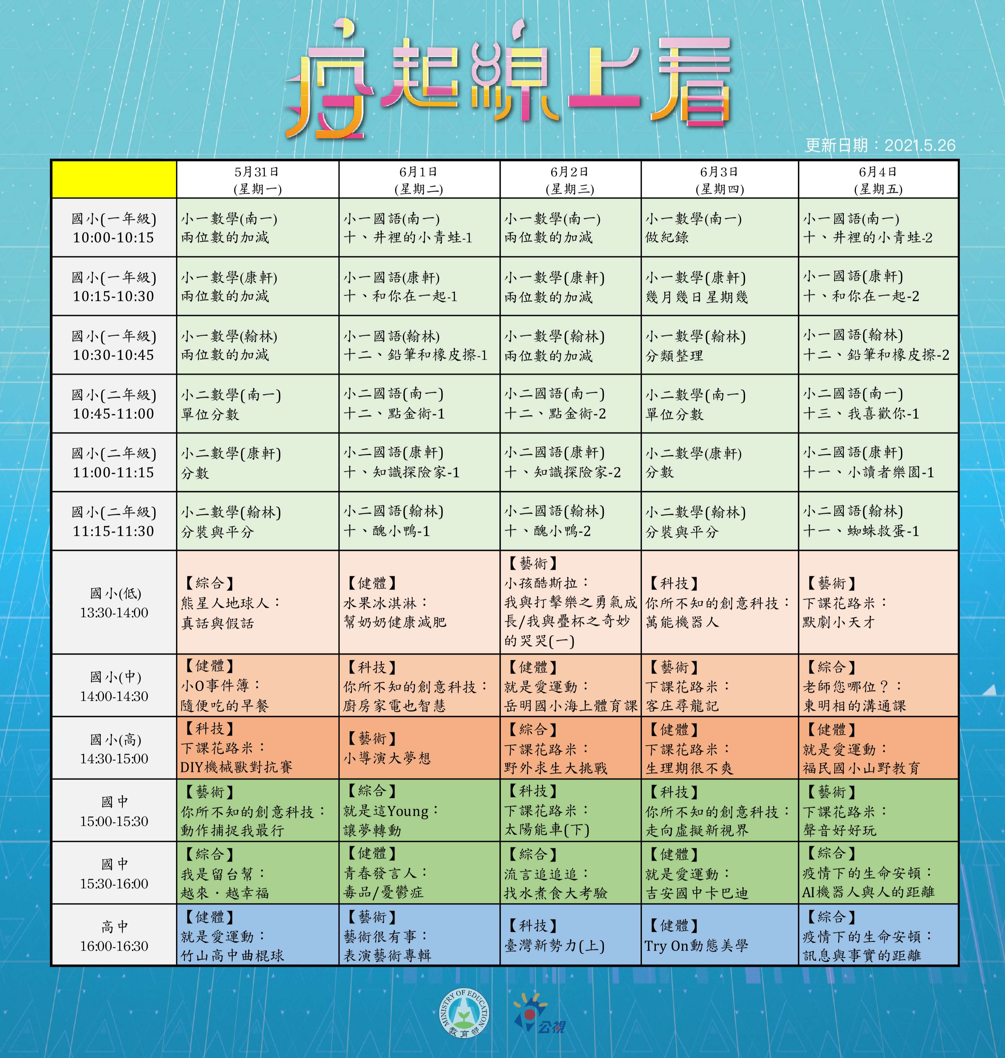 有關全國高級中等以下學校因應疫情延長學生停止到校上課,採居家線上學習至110年6月14日(星期一),教育部賡續徵用公視3台自110年5月31日起週一至週五播出「疫起線上看」電視教學節目,說明如下:
